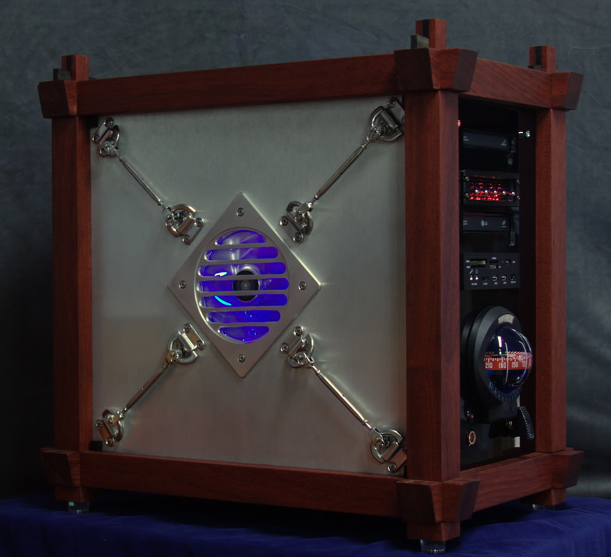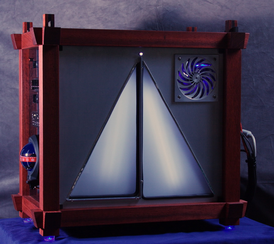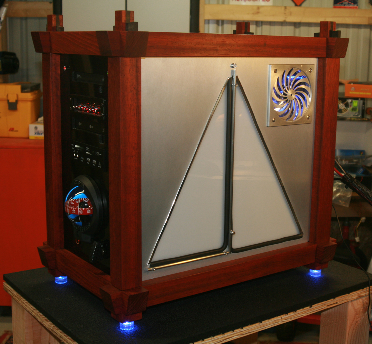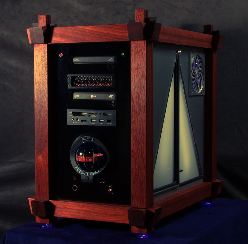 The Newport case was built as a tribute to my interests in Sailing & Computers. I have sailed a Newport 28' for many years and named the computer for it. The wood is African Paduk which has the same density as teak. My daughter Jenna did the design work on the Sail side of the case. Yes that is a working compass on the front.